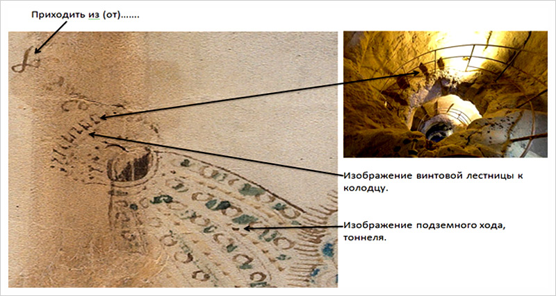 В този случай се наблюдава почти пълно съответствие на чертежния елемент с реалната спирална стълба, водеща до обсадната ямка. Нещо повече, в този случай беше възможно да се преведе една (за съжаление) дума, която означава: „произхождат от (от) ...“. Няма съмнение, този превод е напълно съобразен с предмета.